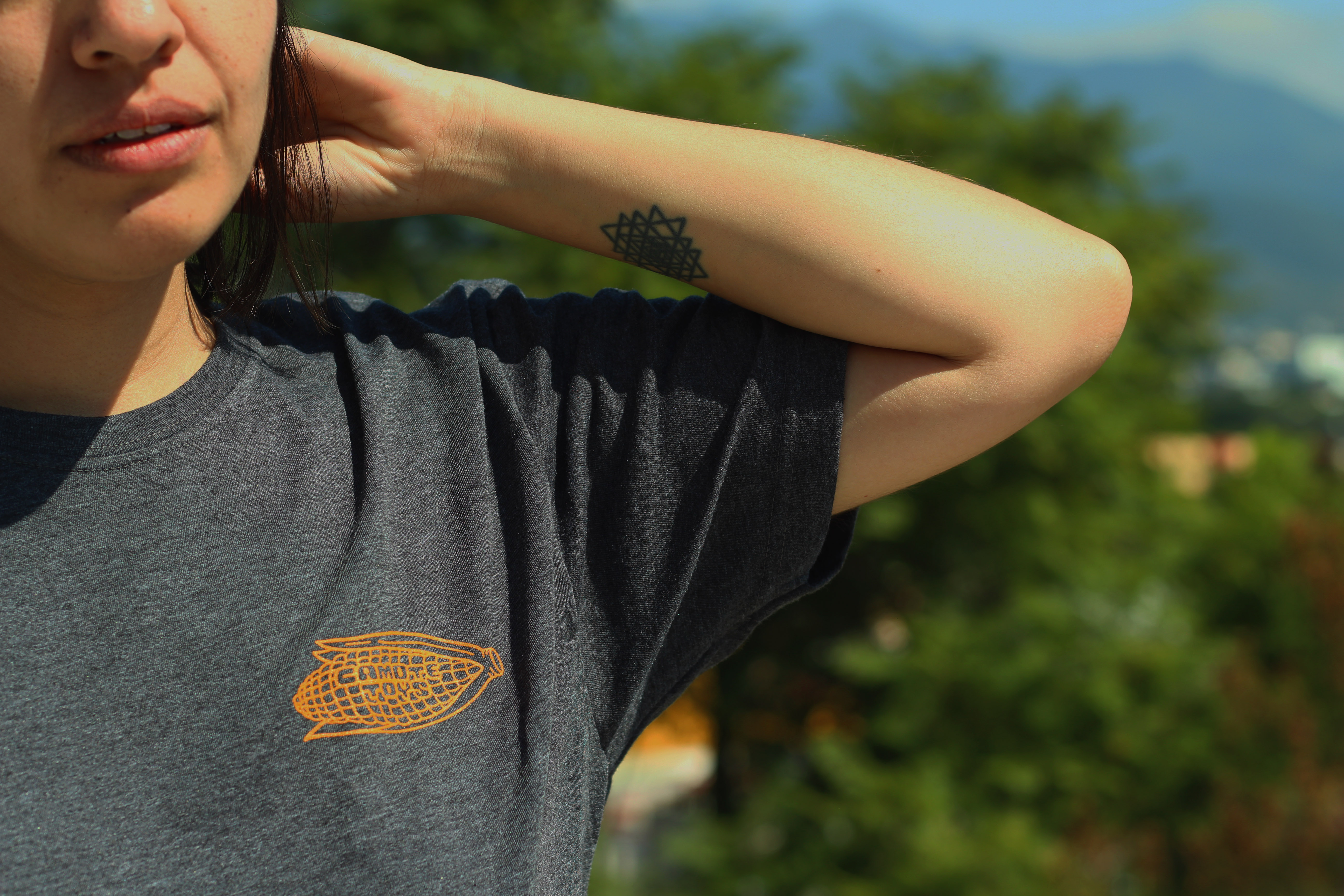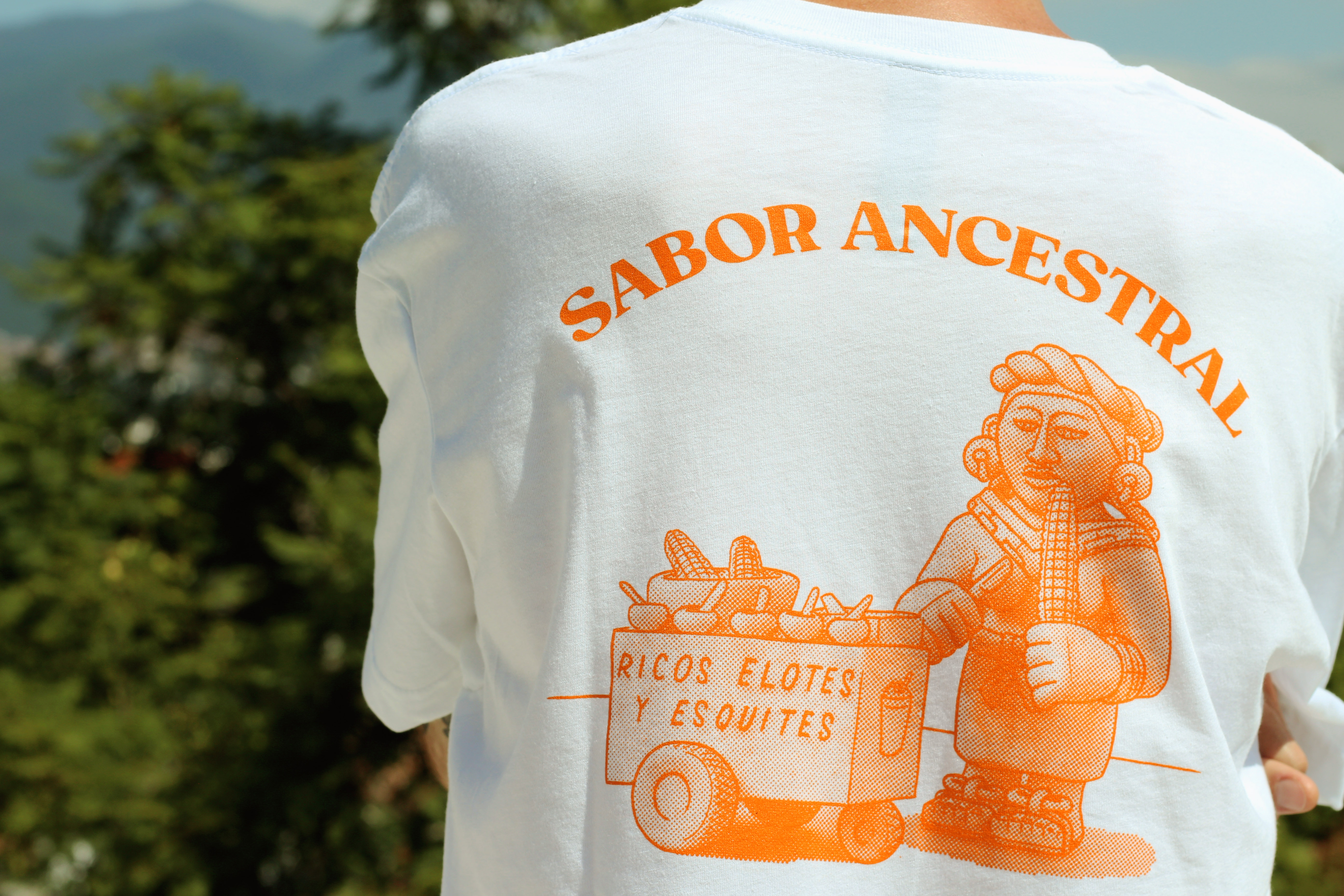 "ANCESTRAL FLAVOR" Handprinted t-shirt. 50% cotton 50% polyester Silkscreen printed with plastisol ink. Colors: white, black or grey.