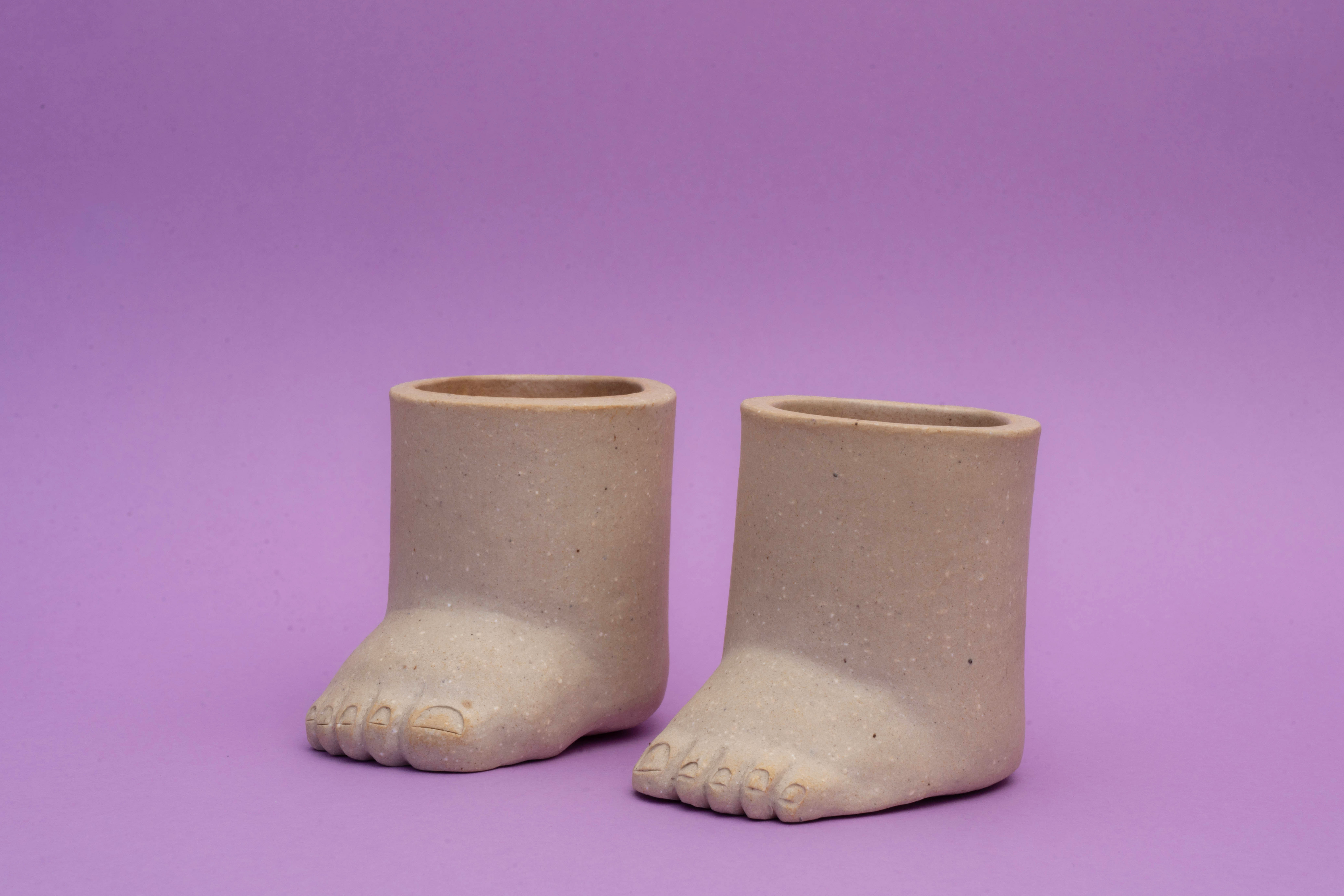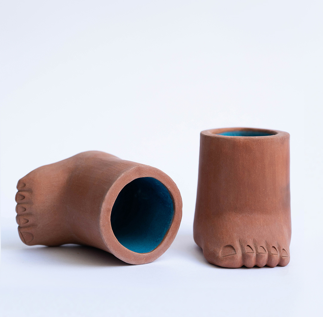 "MUD FEET" Handmade ceramic mezcal set. Burnished white clay (hi-fire) and glaze or burnished red clay (low-fire) and glaze. Sold in pairs. Size: 5 x 6 x 7 cm / 2 x 2.25 x 2.75 in