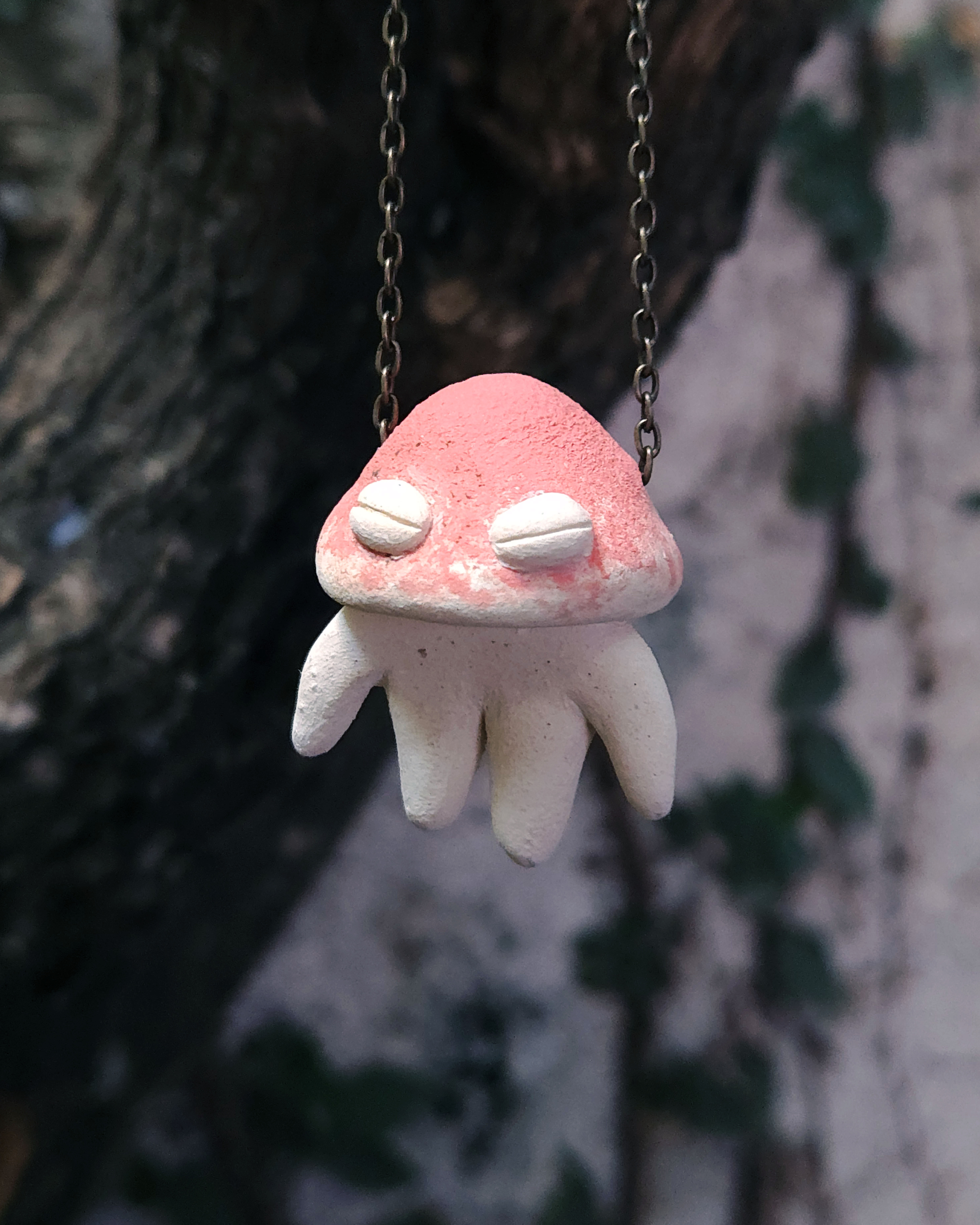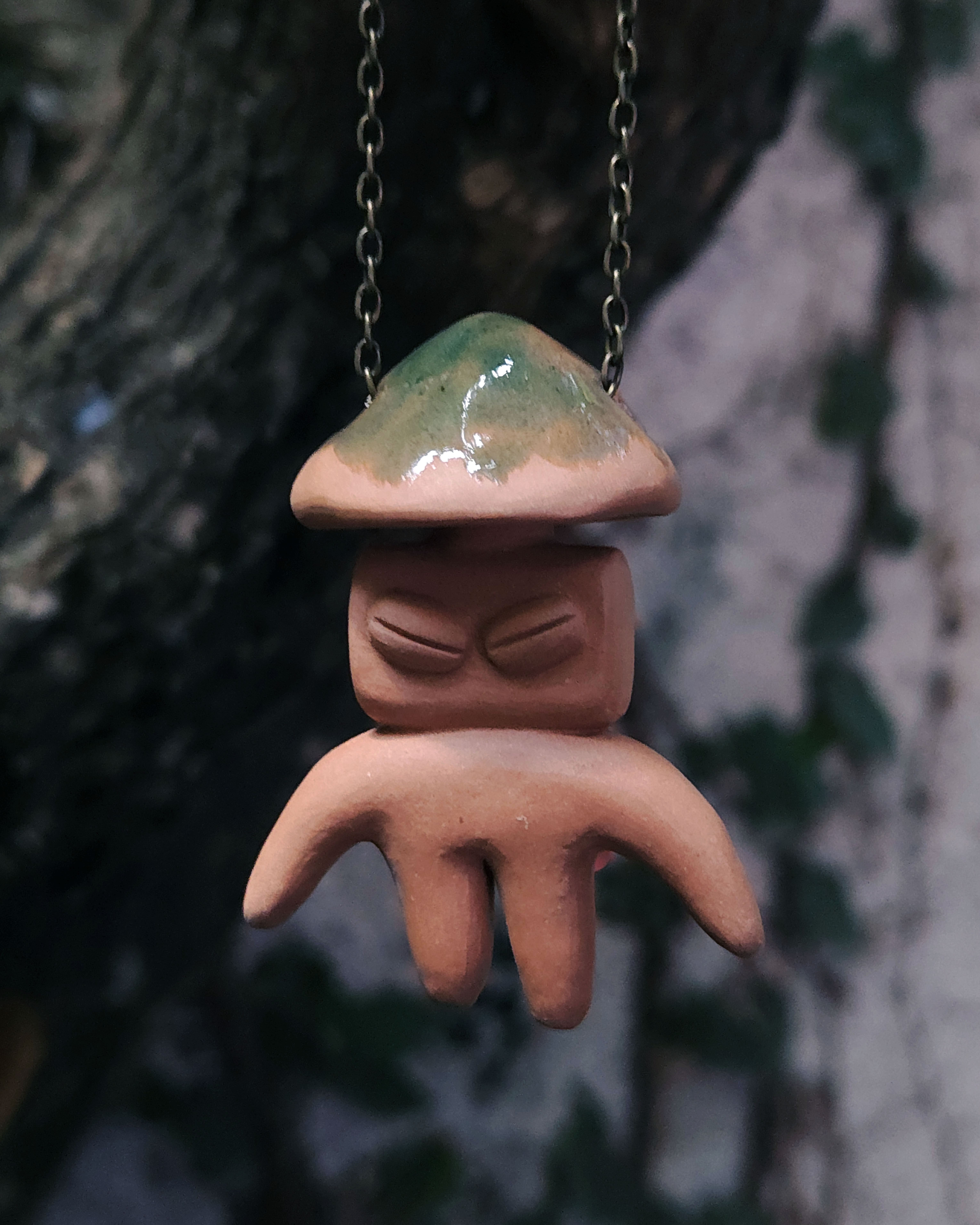 FUNGINI Handmade ceramic jewelry. Burnished red clay (low-fire) with glaze and white clay (hi-fire) with underglaze. One-off pieces. Size: 5 x 4 x 3 cm / 2 x 1.5 x 1.25 in